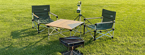 [テーブル/LEDランタン/焚き火台セット(焼網付き)/椅子×2脚]